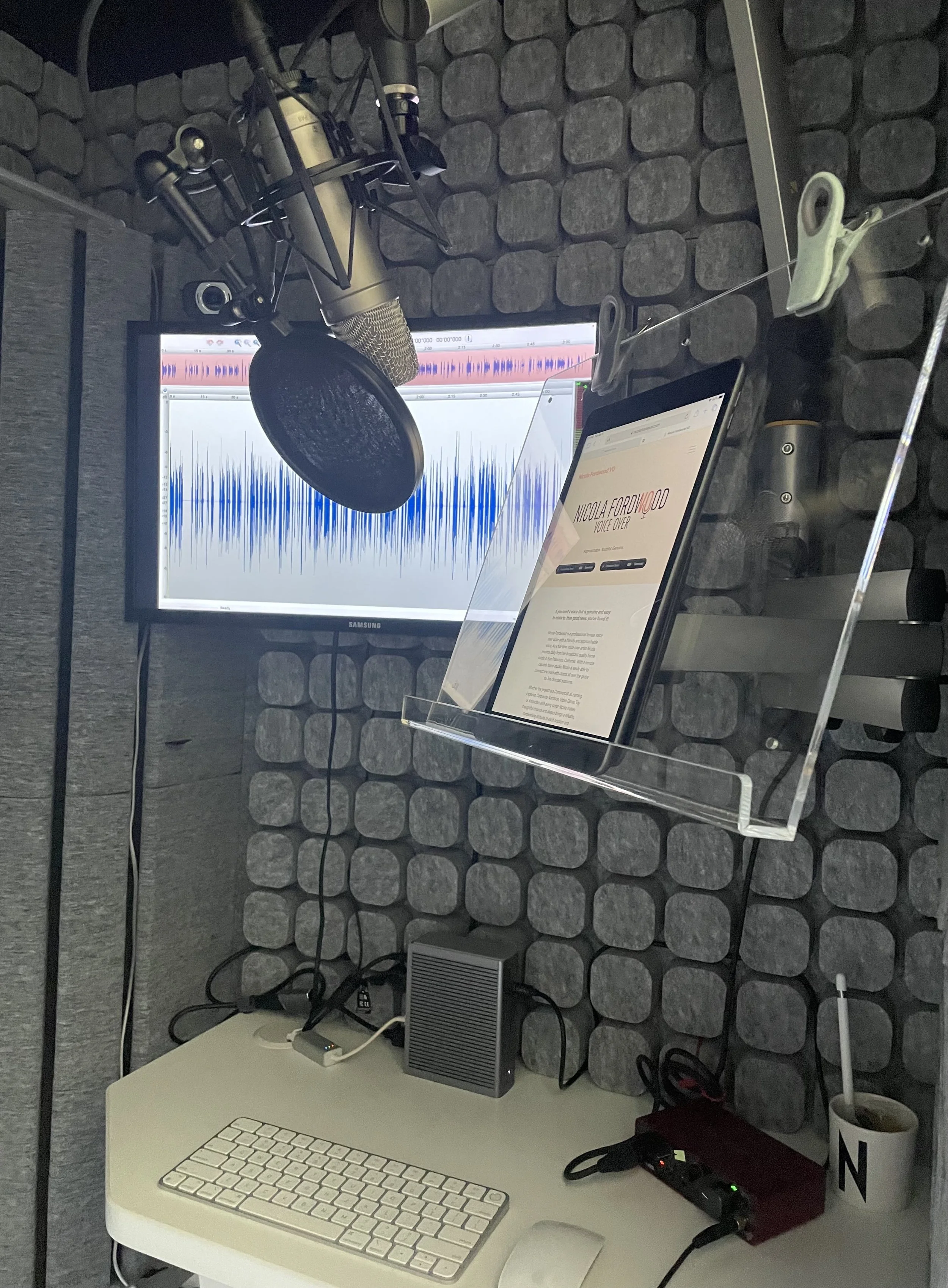 Nicola’s professional broadcast-quality-sound home recording studio includes the following: